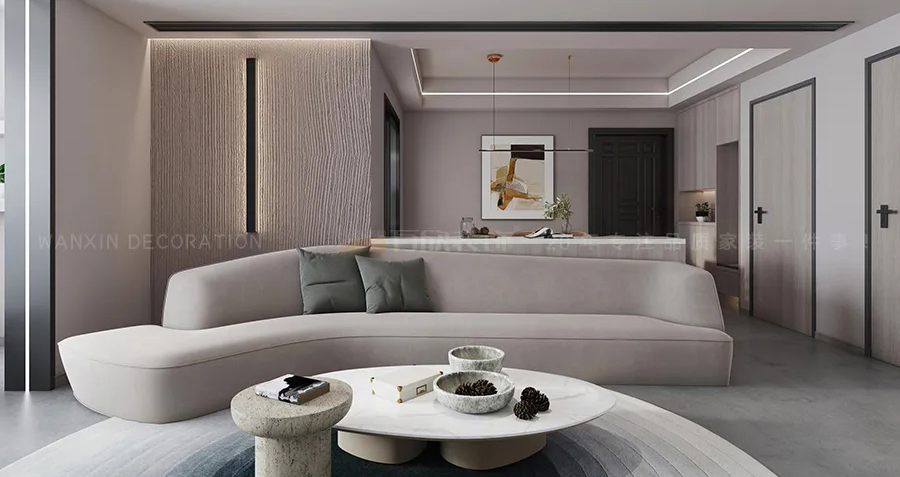 本案定位于現(xiàn)代極簡風(fēng)格,給人一種唯美純凈的自然感受。形式簡約、藝術(shù)感、人文性,這些是本案設(shè)計師在這個住宅空間里想要盡力去打造的。用色彩、材質(zhì)、家具的款式去呈現(xiàn)空間的氣、韻和美。