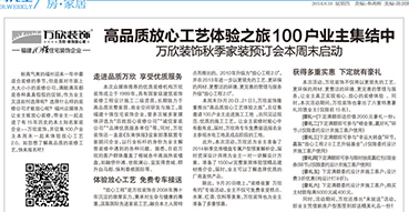 查看詳情2014年6月23日,福州十強(qiáng)萬(wàn)欣裝飾夏季奢華宅家裝節(jié)圓滿(mǎn)成功,本次活動(dòng)為期進(jìn)行了2天(6月21日~22日),本場(chǎng)活動(dòng)是以一場(chǎng)“道設(shè)計(jì)、優(yōu)體驗(yàn)、高品質(zhì)、享特惠”為特色的家裝服務(wù)節(jié),來(lái)訪(fǎng)客戶(hù)均能體驗(yàn)到萬(wàn)欣裝飾的高品質(zhì)服務(wù)。