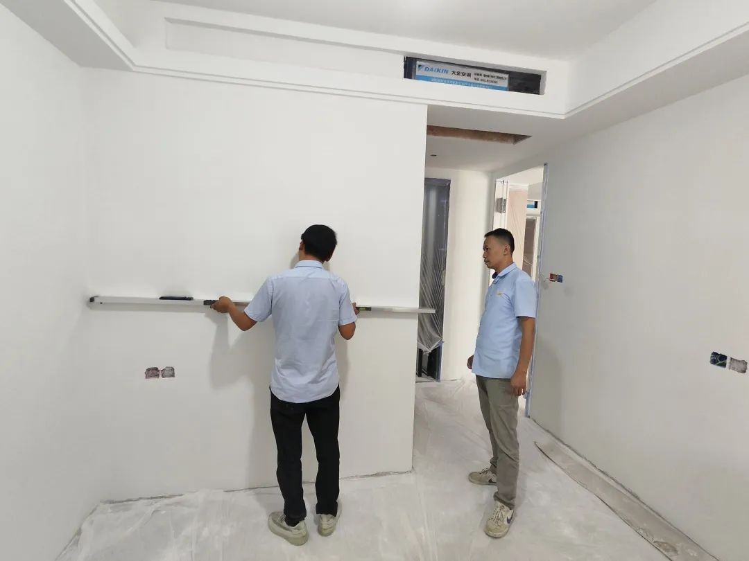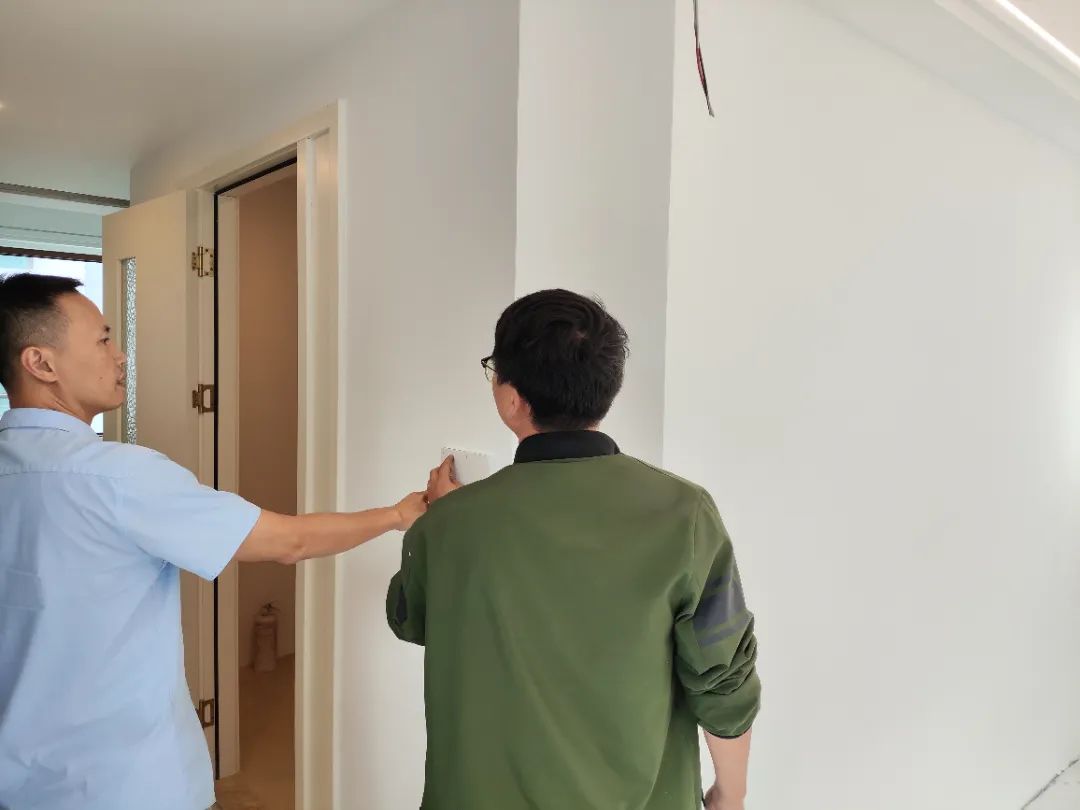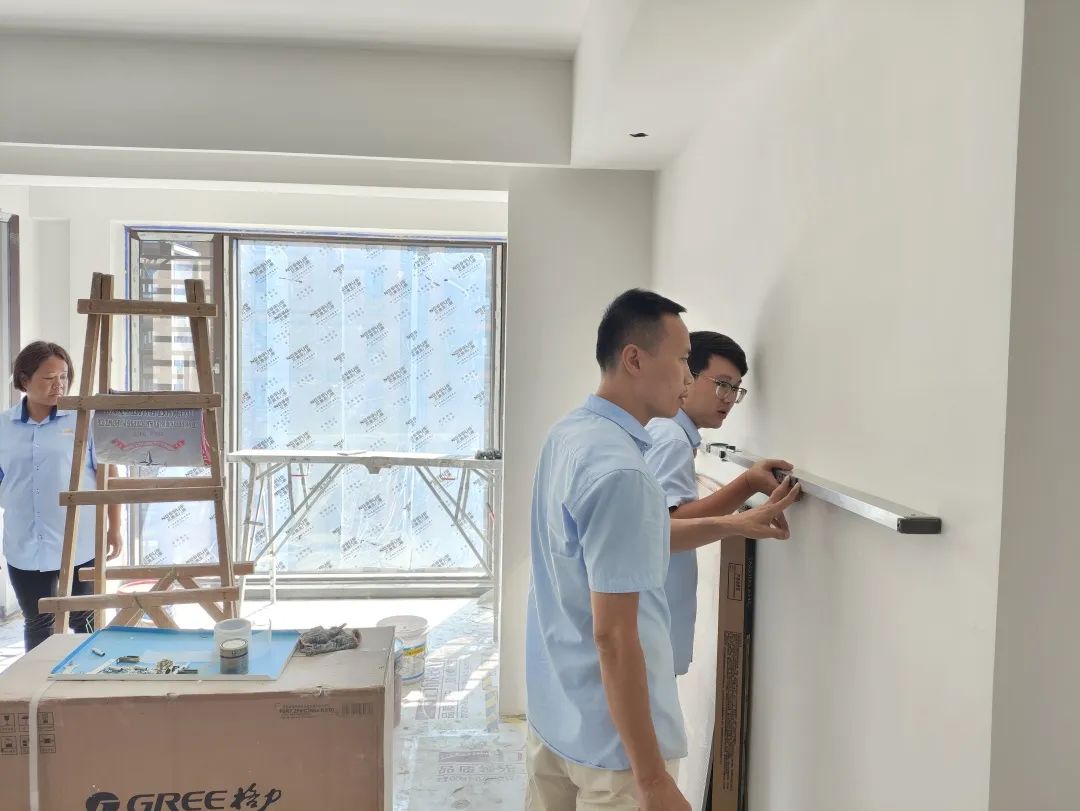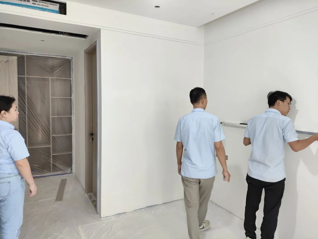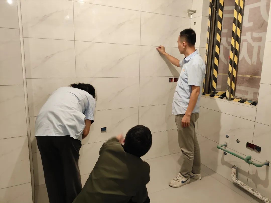 △現(xiàn)場對油漆、柜子、衛(wèi)浴等已安裝設(shè)備進行仔細檢查,確保業(yè)主入住后的正常使用。