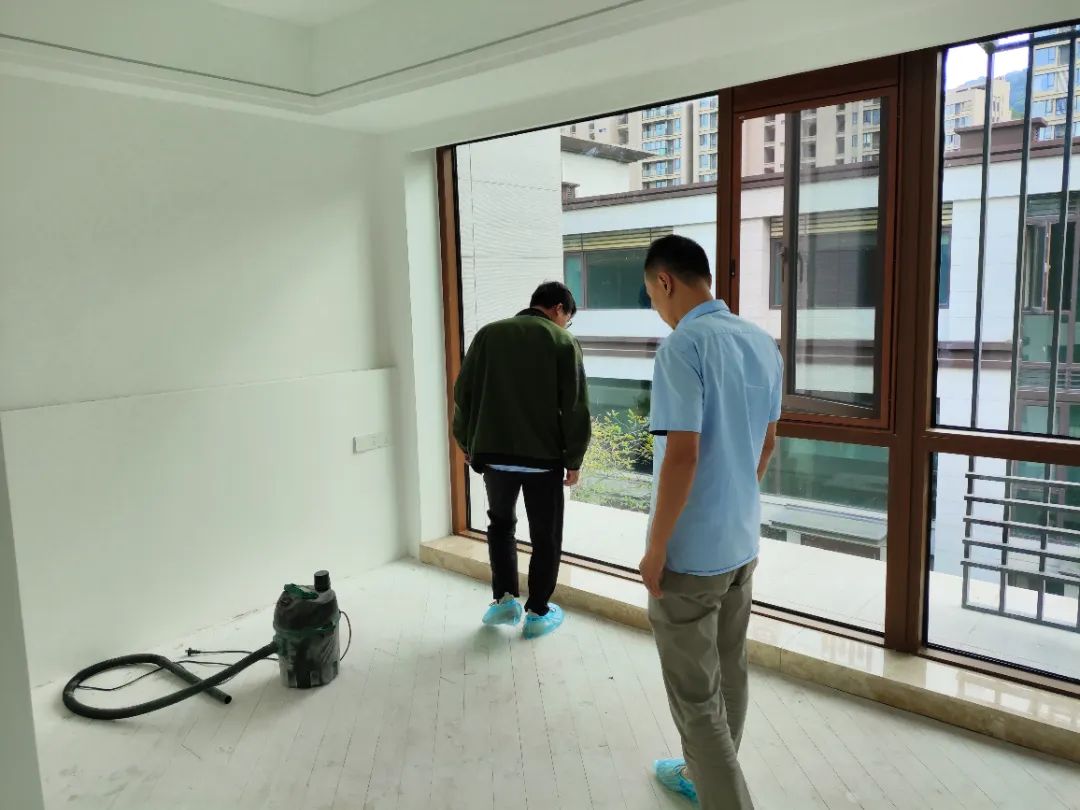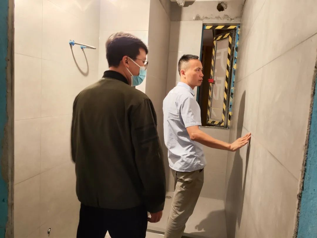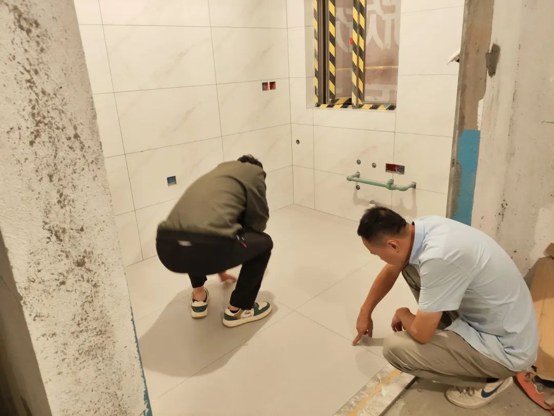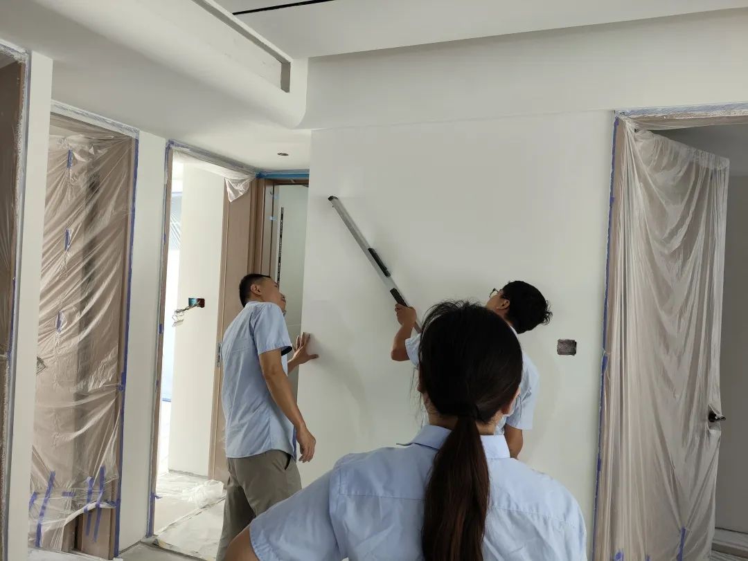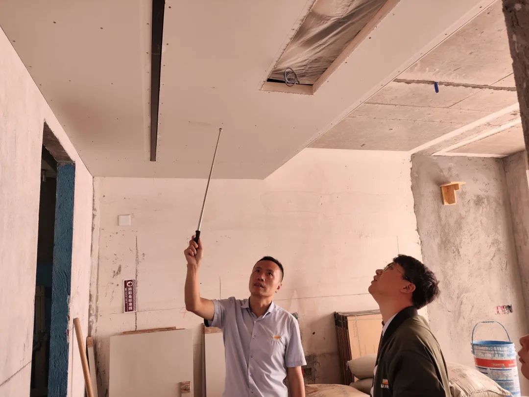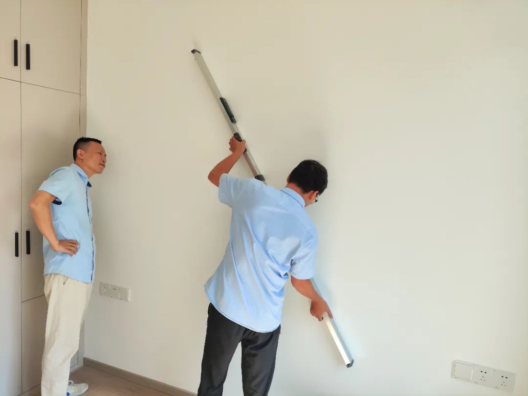 △現(xiàn)場對油漆、柜子、衛(wèi)浴等已安裝設(shè)備進行仔細檢查,確保業(yè)主入住后的正常使用。
