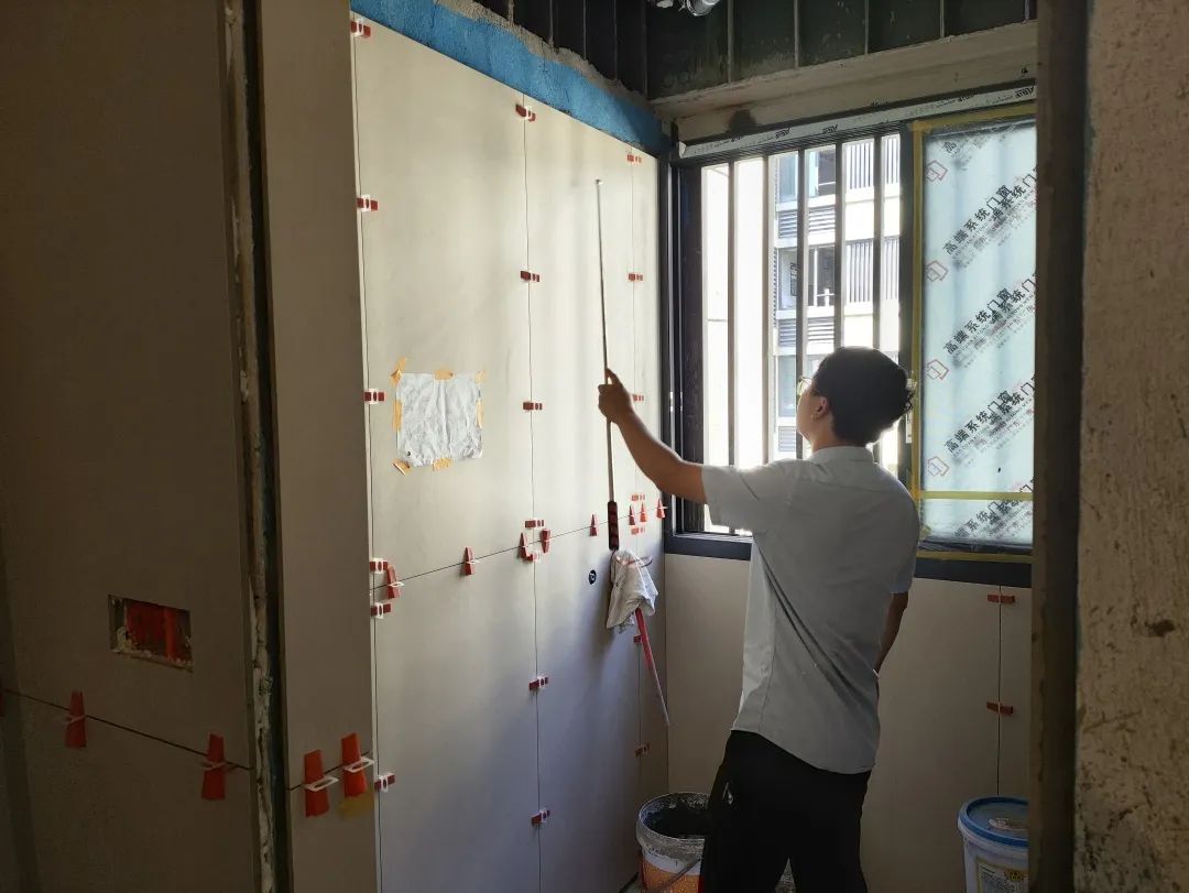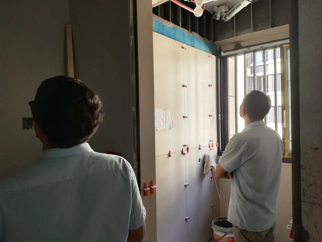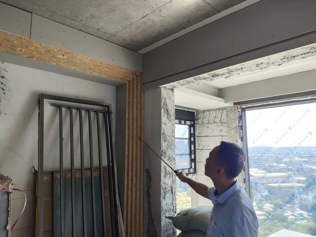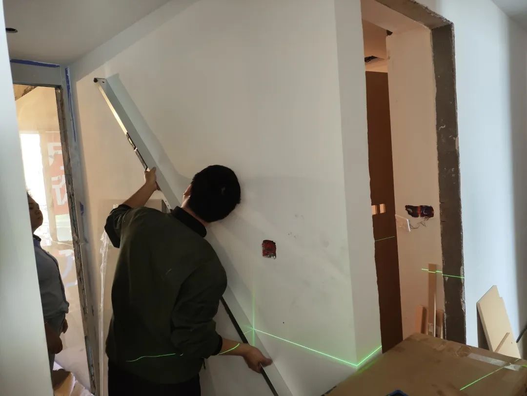 △用兩米靠尺和激光水平儀測量新砌墻的平整度和垂直度,新砌墻體平整,提高后續(xù)墻體粉刷及油漆工藝墻面平整度,為后續(xù)工藝的施工打好基礎(chǔ)。