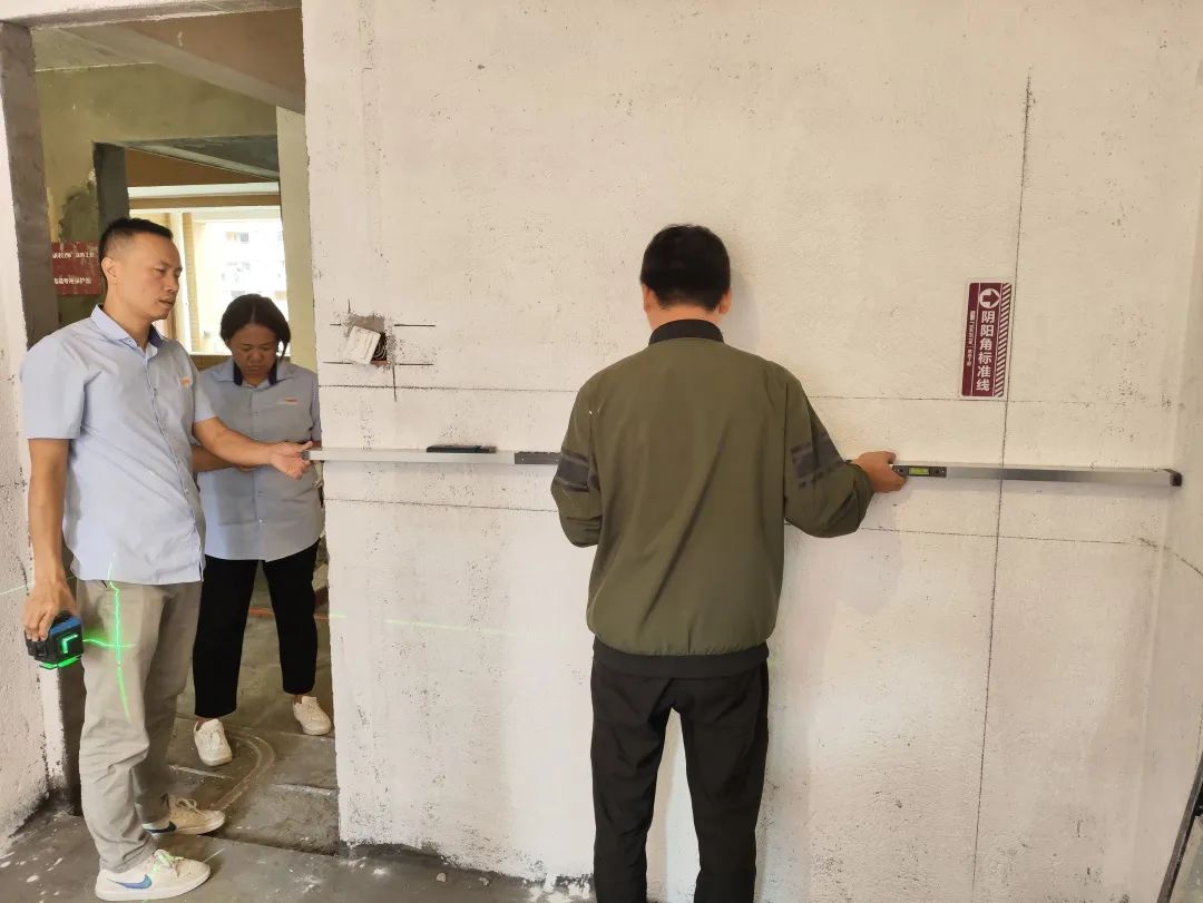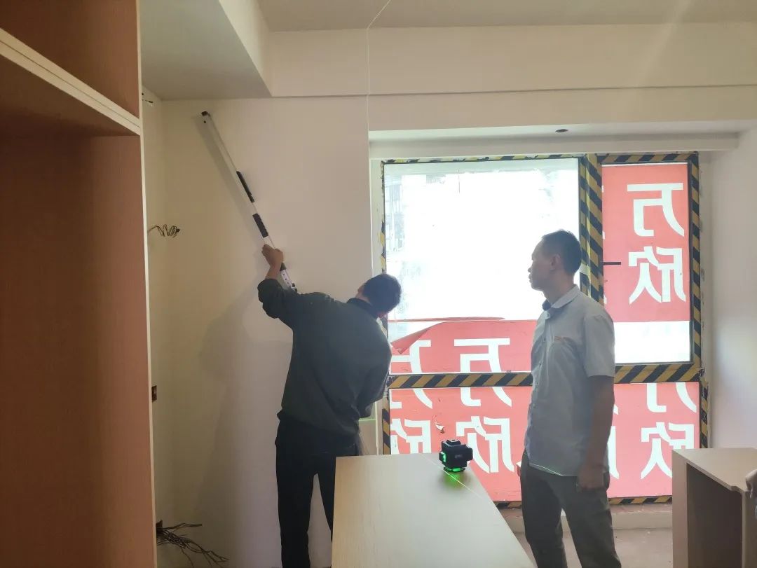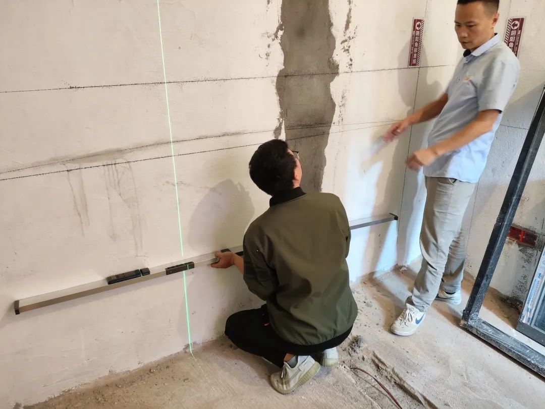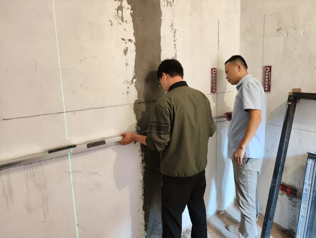 △現(xiàn)場用兩米靠尺和激光水平儀測量墻體的平整度和垂直度。