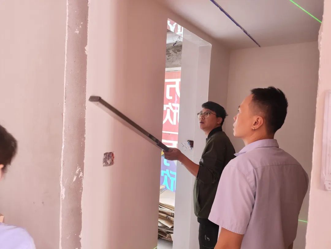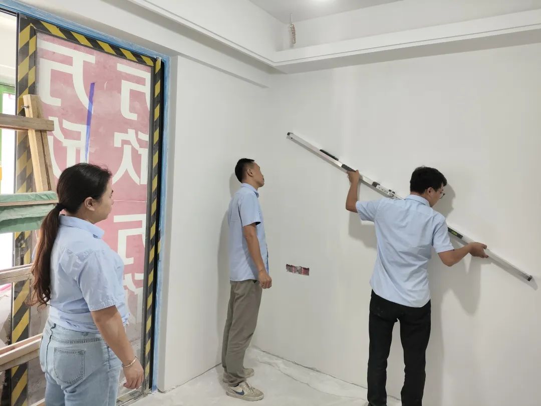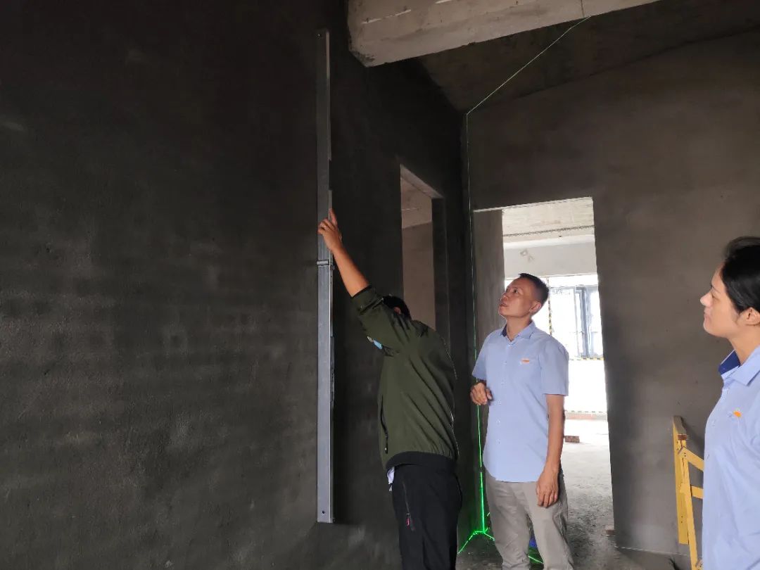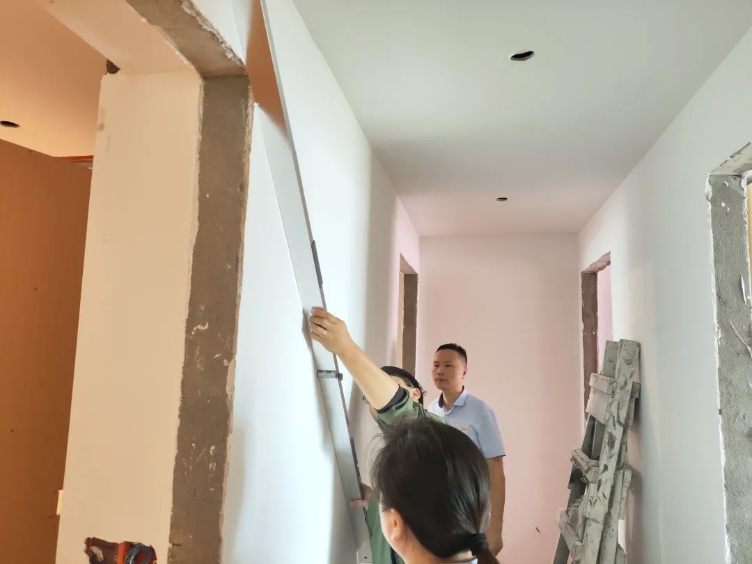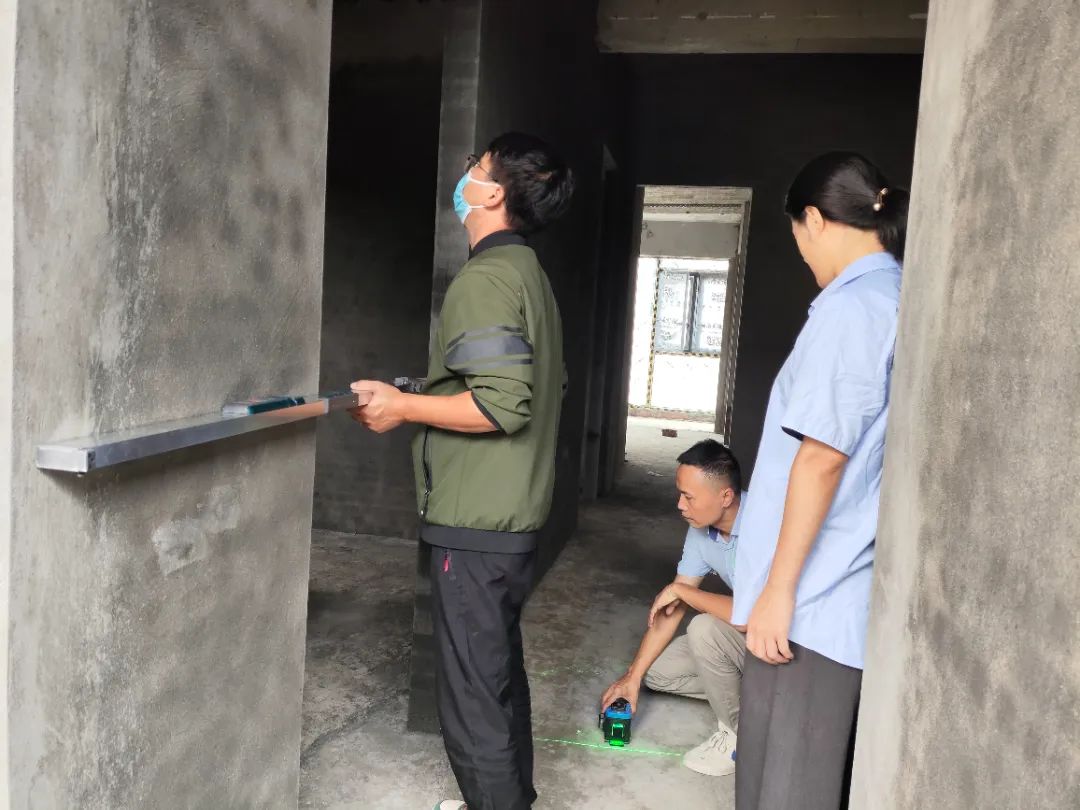 △現(xiàn)場用兩米靠尺和激光水平儀測量墻體的平整度和垂直度。